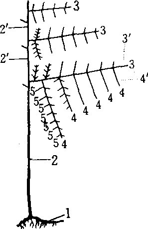 复叶分枝图 1.根状茎 2. 叶柄2′.叶轴 3. 羽片3′.羽轴 4. 一回小羽片4′.小羽轴 5. 二回小羽片 |