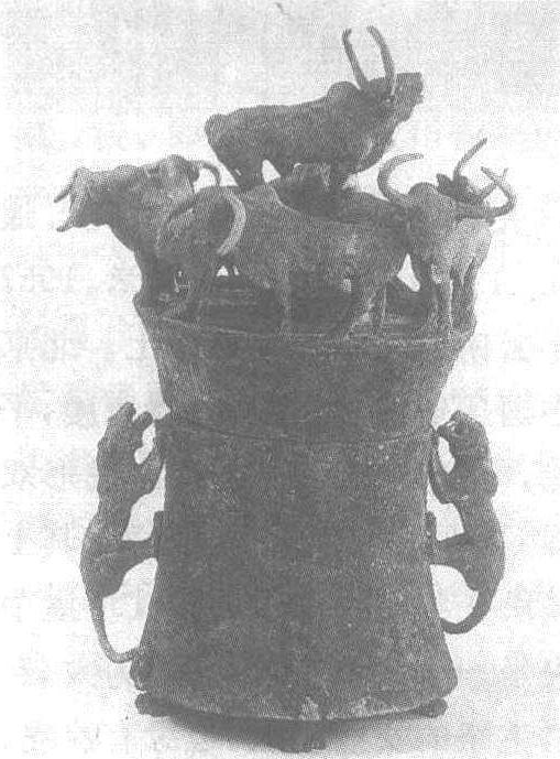 七牛铜贮贝器西汉后期青铜器,1956年底云南省晋宁县石寨山滇国王族墓出土。通高四十四厘米,口径十六点七厘米,底径二十一点六厘米,由器盖和器身两部分组成。盖面上雕铸七牛,居中一牛立于小型铜鼓之上,六牛沿盖面边缘环立一周,均作巨角有峰长尾形,躯体点刻细毛。器身束腰,设对称两虎身,虎身铸刻斑纹,器底设四虎爪形足。盖外壁上端线刻云纹带一周,下刻展翅飞行的犀鸟一周共八只,形体基本相同。其中七只躯体刻鳞状羽毛,一只鳞状羽毛之上又点刻细密羽毛;器身外壁自右身向左的图案是:一棵树下卧伏一虎,树上端一熊直立,树的左前方卧伏梅花鹿一只。左耳向左,第二棵树下八虎跃起,似正扑捉一只奔鹿,树的左上方似为一只大型飞禽。再向左,第三棵树之左上方有鹿一只。器底边刻云纹带一周。以上八只犀鸟、二虎、一熊、三鹿、一鸟和三棵树,上下以云纹相衬,均匀布满器身,比例正确,形态生动,雕刻刀法较细腻。该器现藏于中国历史博物馆。 |