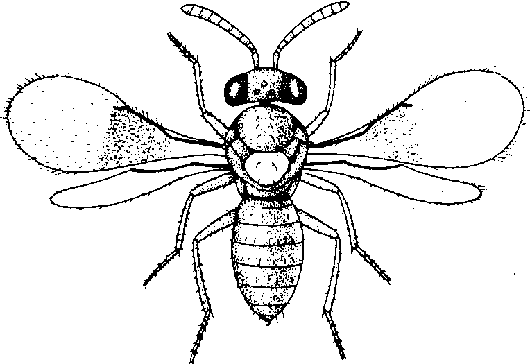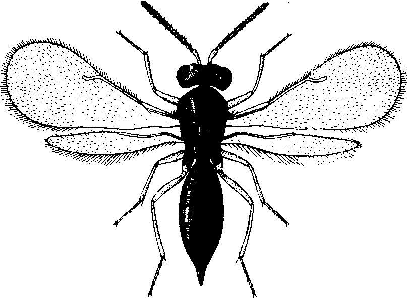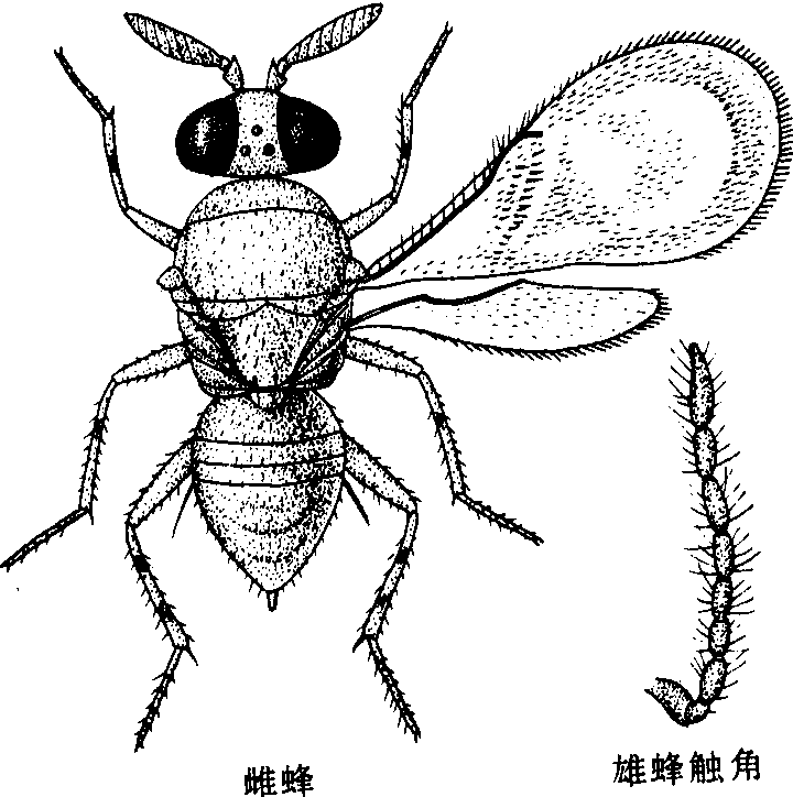 图 2 螟卵啮小蜂 蚜小蜂 蚜小蜂科。微小、脆弱,体长不及1毫米,黄至黑褐色,无金属光泽,触角至多8节; 盾纵沟发达; 前翅缘脉较长,痣脉短,后缘脉不发达; 中足胫节距较长但不粗大。它是蚜虫、蚧虫和粉虱的主要寄生蜂,多数种类能抑制寄主的种群数量。某些蚜小蜂,如黄盾捕虱蚜小蜂(图3)、岭南黄金蚜小蜂、丽蚜小蜂和苹果绵蚜小蜂等,在防治果树、园林害虫中作用良好。 跳小蜂 跳小蜂科。较粗壮,体长一般1~2毫米,大的可达4~5毫米,具深黄、褐或黑色金属光泽; 触角至多11节; 盾纵沟浅或缺; 中足胫节距粗而长,善跳; 前翅缘脉和后缘脉均甚短。种类丰富,寄主范围甚广。寄生于昆虫的卵、幼虫和蛹。内、外寄生均有,一些种类为重寄生,也有兼具捕食习性的。寄生鳞翅目幼虫的有些有多胚生殖现象,如多种多胚跳小蜂。中国常见种类有巨角跳小蜂、长索跳小蜂、刷盾跳小蜂、花翅跳小蜂和卵跳小蜂等。寄生于益虫白蜡虫的白蜡虫花翅跳小蜂和寄生紫胶蚧的黄胸胶蚧跳小蜂则有害。以红蜡蚧扁角跳小蜂(图4)防治红蜡蚧是一著例。