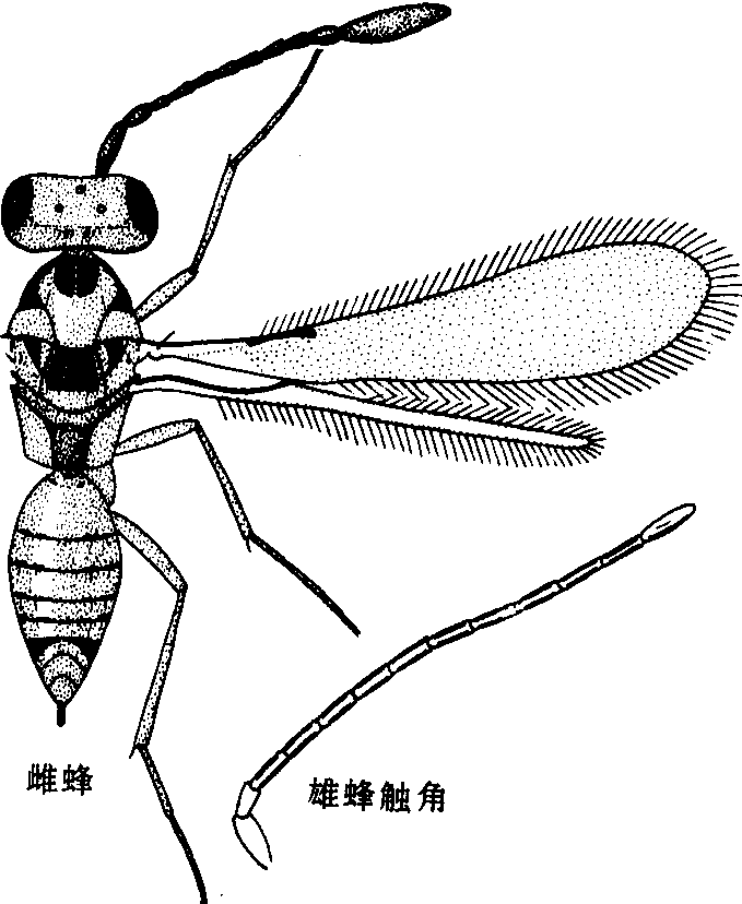 旋小蜂 旋小蜂科。似跳小蜂,体长2~4毫米,常具金属光泽。但触角具1个环状节和7个索节、前胸背板不横宽而向前收窄、前翅缘脉甚长,这些特征可与跳小蜂区别。寄生各种昆虫体内。中国常见主要种为平腹小蜂。此外,寄生稻瘿蚊的稻瘿蚊长距旋小蜂和东方长距旋小蜂寄生率也较高,有利用前途。 赤眼蜂 见赤眼蜂。 缨小蜂 缨小蜂科。体长不及1毫米;触角细长,雌虫8~11节,雄虫10~13节;前翅狭长,翅脉极不发达,缘毛甚长。多为卵寄生蜂。中国常见的如寄生多种黑尾叶蝉卵的叶蝉柄翅小蜂(图5),寄生褐飞虱等卵的多种飞虱缨小蜂,一般寄生率都较高,有利用前途。 |