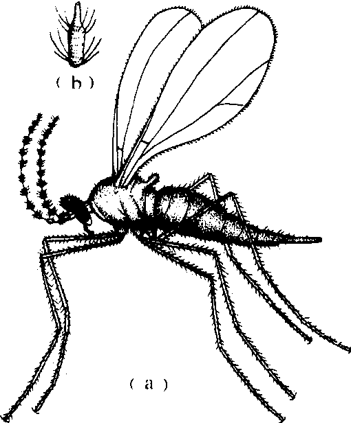 图 2 麦黄吸浆虫(雌) 吸浆虫幼虫隐蔽在麦壳内为害,受害麦穗颖壳闭合,呈黄白色。一头幼虫可为害1/3至一颗麦粒,一个麦穗有虫70~80头,最多达400余头。小麦受害后形成秕粒,造成减产或失收。由于幼虫休眠期很长,受土壤温湿度的影响很大,夏季高温干旱,幼虫死亡率约50~60%,春麦区越冬死亡率也较高。破茧上升活动,土温达15℃化蛹。温度超过30℃以上,幼虫又恢复休眠。在化蛹期间雨量多,田间灌水及时羽化率就高。土壤含水量低于15%,成虫很少羽化。土壤含水达20~25%时,化蛹、羽化率高,成虫大量发生。春季3~5月间天气多阴雨,幼虫易于破茧、化蛹和羽化,有利于幼虫从麦壳中爬出入土潜伏。麦收前干旱无雨,幼虫不能蜕皮出壳,随小麦收割被带到麦场上,经日晒碾压,可造成大量死亡。壤土最适于吸浆虫的生活和发生,粘土对其发生不利,砂土地更少。麦红吸浆虫适于在微碱性土壤中生存,而麦黄吸浆虫喜较酸性土壤。成虫喜在小麦、大麦、黑麦上产卵。凡颖壳扣合紧密的品种,麦红吸浆虫幼虫不易侵入。 20世纪50年代初小麦吸浆虫在中国曾猖獗发生,通过种植南大2419、西农6028、西北站2号等抗虫品种,施用六六六农药进行土壤处理,防治土中的幼虫和蛹,控制了危害。80年代又研究出用甲基异柳磷粉剂土壤处理和用甲敌粉、乙敌粉等防治成虫,以取代六六六,获得良好防治效果。 小麦吸浆虫成虫俗称“红蚊”,幼虫俗称“麦蛆”,小麦害虫。昆虫纲,双翅目,瘿蚊科。主要有麦红吸浆虫(Cecidomyia moscllanc)和麦黄吸浆虫(Contarinia 小麦吸浆虫俗名叫小红虫、黄疸虫、麦蛆等。50年代传入甘肃。在甘肃的小麦吸浆虫有麦红吸浆虫和麦黄吸浆虫两种,属于双翅目,瘿蚊科。麦红吸浆虫:成虫为桔红色,小麦开始吐穗时,相继羽化出土,交尾产卵(长卵形,淡红色)于已抽穗而未扬花的麦穗上,经过3~5天孵化为幼虫(橙黄色),此时正值小麦扬花灌浆期, 钻入麦的颖壳内吸食籽粒的浆液,使麦粒干瘦;约再经过20天左右,脱皮两次成为老化幼虫,从颖壳内爬出,弹落或随雨水、露水滴落地入土3~13厘米深处;再经过2~4天结圆茧入土休眠。至来年春季环境适宜(小麦拔节前后,土壤中有适当的水分, 10厘米土温升到10~15℃左右)时,越冬幼虫破茧上升到土表逐渐化蛹、羽化出土继续危害。麦黄吸浆虫:成虫和幼虫均为姜黄色。卵为稍弯曲的长圆形,淡黄色。生活习性与麦红吸浆虫大致相同,但在同一地区的化蛹及羽化时期早。防治法:(1)确定防治范围:在春季解冻后至小麦拔节前期间,采取5点淘土取样检查幼虫量的方法确定。即每16. 5厘米见方、20厘米深的土中有幼虫5头以下者为一般分布区; 5~40头为轻害区; 40~100头为重害区;100~250头为严重区;250头以上为极严重区。(2)确定防治时期:采取检查成虫数量的方法来确定。即从当地早熟小麦开始出穗至乳熟期,选择不同播种期的麦田2~3块,逐日进行检查。检查的方法是,在麦垄中蹲下,两手轻轻拨开麦株,一眼看到3~5头成虫起飞;或用口径0.3米,柄长1米的捕虫网兜10多次能捕到成虫10~25头左右, 即为成虫成盛发期,为用药防治时期。(3)选育推广抗虫良种,即可控制其危害,又能压低土壤中幼虫的残存量。(4)药剂防治:小麦播种前的最后一次浅耕时,每亩均匀撒入21~21. 5公斤毒土(6%六六六粉1~1.5公斤, 兑细土现20公斤) 后立即翻耕, 进行防治。使用乐果毒沙、辛硫磷毒沙、滴滴畏毒沙(药、水、沙的比例为1∶20∶1 000) 防治。在小麦抽穗扬花前,适时喷撒1%六六六粉, 每亩1.5~2.5公斤;如仍有成虫发生,隔5天再喷1次,以制止成虫产卵危害。 小麦吸浆虫昆虫纲双翅目瘿蚊科,俗称小红虫。中国有麦红吸浆虫和麦黄吸浆虫2种。一般一年发生一代。麦红吸浆虫成虫长2~2.5 mm,翅展约5 mm,触角14节。老熟幼虫长3~3.5 mm,蛹长约2 mm。麦黄吸浆虫长约1.5~2 mm,幼虫2.5 mm。防治措施有选用抗虫品种,稻麦轮作和药剂防治。药剂有:4%甲敌粉、40%甲敌乳油、50%甲基对硫磷乳油、80%敌敌畏乳油等。 |