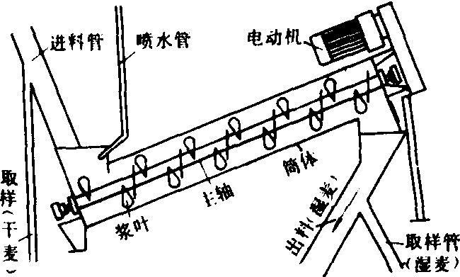 着水混合机结构示意图 水杯着水机 主要由叶轮和装有水杯的水杯轮及水箱组成。使用时小麦流动而冲击叶轮旋转,从而带动水杯轮转动。当水杯转入水箱中,即将水舀起倒入着水螺旋与小麦混合。该机利用小麦流动的力量作为动力,当小麦流量减少,水杯转速慢,加水就少。反之,加水就多。水杯着水机必须与着水螺旋配合使用,才能进行混合和搅拌,一次着水不能超过3%。 喷雾着水机 用于增加入磨小麦表皮水分,使麸皮不易破碎,其工作过程是将水滴和麦粒各落在一个旋转的圆盘上,小麦均匀撒向四周与成雾状的水珠混合,水分能快速而均匀地附着在麦粒表皮上。一般加水0.5%左右,经20~30分钟渗透,随即入磨粉机。由于麦皮与胚乳含有不同的水分,能达到麸皮不易破碎而胚乳容易破碎的工艺要求。 |