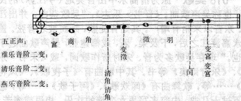 | 释义 | 012 七音泛指传统七声音阶及其七个音级。《左传·昭25》子产论乐:“为九歌、八风、七音、六律,以奉五声。”七音也称“七律”,如《国语·周语下》伶州鸠论乐:“故以七同其数,而以律和其声,于是乎有七律。”七音或七律中的宫、商、角、徵、羽五声称为正声,余二声称为“二变”。由于历史上各地区对二变的应用和它们在七声音阶中所处的位置不同,从而形成三种不同的七声音阶组织形式。如下表(二变在音阶第四、七两级,各有两个不同音位,用黑符头表示):