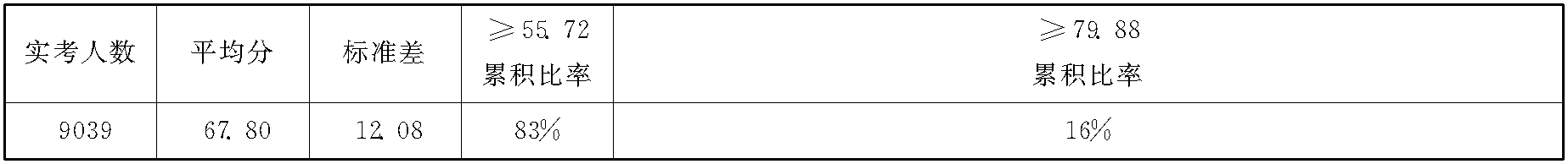 S=12×(X-MEAN)/SD+72 其中S为报导的分数,X为经过加权处理的原始分,MEAN为平均分,SD为标准差。经过这一线性转换,常模均值变为72分,标准差为12分;原来的及格线移到了报导分的60分;优秀线移到了报导分的84分(正式使用时,优秀线为85分)。 |