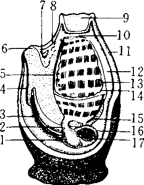 海鞘内部构造 1. 胃 2. 食道 3. 生殖导管 4. 肛门 5. 背沟 6. 泄殖管孔 7. 神经节 8. 垂体导管 9. 口管 10. 缘膜与其触手 11. 被囊 12. 体壁 13. 鳃裂 14. 内柱 15.心脏 16. 肠管 17. 生殖巢 |