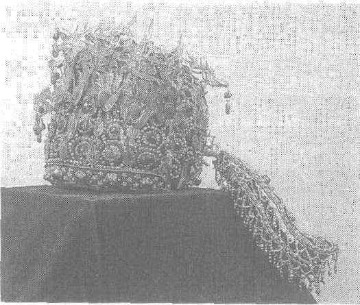 | 释义 | 万历孝靖皇后嵌珠宝点翠凤冠明。高26.5厘米,口径23.7厘米。重2.32千克。1956年北京市昌平定陵出土。北京中国历史博物馆藏。定陵系明神宗朱翊钧及孝端、孝靖两后的陵墓。建在北京昌平天寿山,是著名的明十三陵之一。墓室宏大,随葬品丰厚。此凤冠是孝靖皇后的随葬品。所谓凤冠,即饰有龙凤的帽子,为古时妇人至尊贵的头饰,皇妃们所服用。如《明会典》中有云:“皇妃常服,花钗凤冠。”整个冠架采用细竹丝编制,然后上漆。通体嵌各色珠宝。前部近顶饰九条金龙,龙衔“珠滴”。下为点翠八凤,后部另有一凤。冠后底部左右悬挂翠扇式翅叶,点翠地,嵌金龙、珠花,花形绚丽,五光十色,耀人眼目。据估计,约需高手三人,用一年时间,方能制成。此凤冠显示了当时镶嵌细金工艺的发达,为明代冠服制度的研究提供了重要的实物。