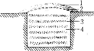 种子层积处理 1. 覆土 2. 草帘 3. 种子 4. 河沙 |