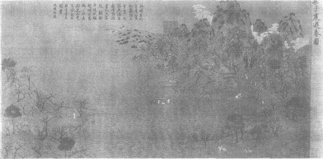 | 释义 | 展子虔《游春图》长卷,绢本,青绿。此卷为我国现存著名画家作品中最古的一幅。画卷展开,一派湖光山色映入眼帘。江水无际,烟波浩渺,两岸群山耸峙,树绿花繁。山间寺院隐显,一行人马于幽幽山径间漫游,另有一行人泛舟于波上。观者仿佛也置身于画中,荡漾于山间水涯,尽情沉浸于春光之中。