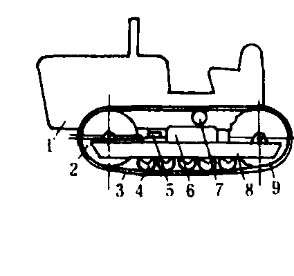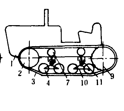 1.拖拉机机体;2.履带张紧轮; 3.履带; 4.支重轮; 5.悬架钢板弹簧;6.张紧缓冲装置;7.托轮;8. 台车架;9.履带驱动轮; 10.平衡杠杆;11.悬架螺旋弹簧