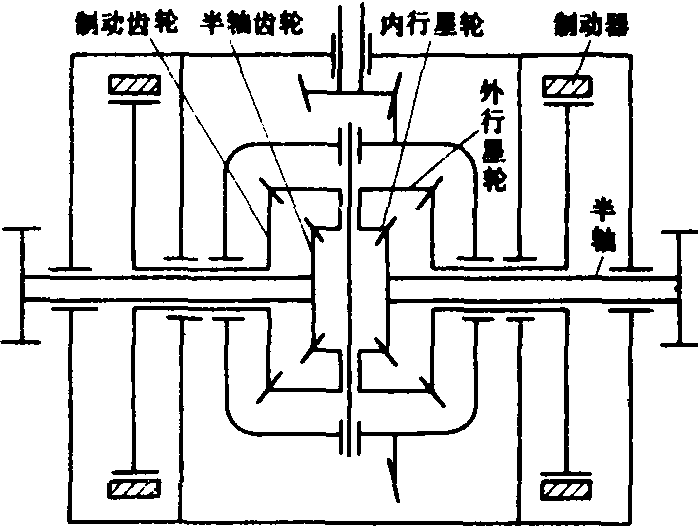 图2 单级行星转向机构示意图 双差速器 具有内、外两套行星轮(图3)。拖拉机直线行驶时,两侧制动器均放松,经中央传动传来的动力,通过内行星轮和半轴齿轮传到两侧驱动轮,外行星轮带动制动齿轮空转。转向时,某一侧的制动齿轮被制动,内、外行星轮除随差速器壳一起转动外,外行星轮还沿被制动的制动齿轮滚动而产生自转,同时带着内行星轮一起自转,使该侧驱动轮转速降低,另一侧驱动轮转速增高。同时,外行星轮将一部分动力传给被制动的制动齿轮,并消耗在制动器上,使该侧驱动轮的驱动力小于另一侧或产生与驱动力反向的制动力,从而造成转向力矩,实现拖拉机的转向。双差速器结构紧凑,后桥宽度最窄,寿命长;结构复杂,农业拖拉机上应用较少。双差速器按齿轮形式分为圆锥齿轮式和圆柱齿轮式。