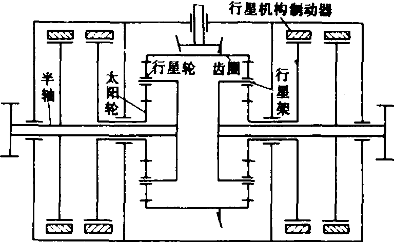 图1 转向离合器示意图 单级行星转向机构 结构如图2。拖拉机直线行驶时,两侧行星机构制动器都制动,半轴制动器都放松,两侧行星架和半轴以相同转速旋转。转向时,先将某一侧的行星机构制动器放松,让该侧太阳轮转动,以减小或切断该侧的驱动力实现转向;再操纵该侧半轴制动器,产生与驱动力反向的制动力,形成更大的转向力矩,实现拖拉机急转弯。单级行星机构结构较紧凑,后桥宽度较窄,寿命长;结构较复杂,在拖拉机上应用较少。