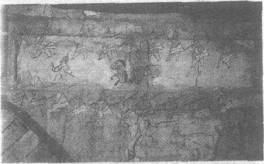 | 释义 | 屯垦图砖画西晋。纵54厘米,横88厘米。甘肃省嘉峪关市3号墓南壁左上角砖壁画。1972年发掘。此画反映的是魏晋时期军队屯田的场面。画面上部有两排士兵持兵器进行操练。两排士兵之间为通道,一骑兵驰马而过。画面下部为驾牛耕田者,扬鞭扶犁行进在田间。犁以红色描绘,在画面上显得尤为突出。汉代以后,历代政府利用士兵在驻地开垦荒废田地的措施,在中国历史上对开发边疆起过积极作用。