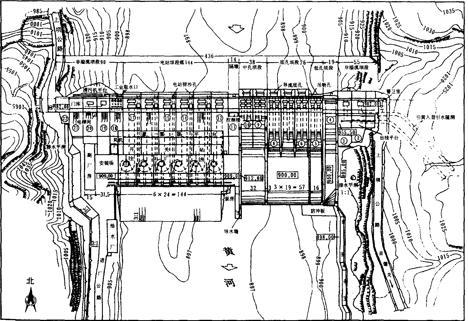 万家寨水利枢纽平面布置图 枢纽工程设计总工期为六年半,1994年底主体工程正式开工,1995年12月9日大河截流成功,1998年大坝下闸蓄水、供水发电,2000年工程将全部竣工。 |