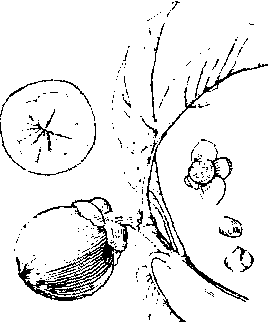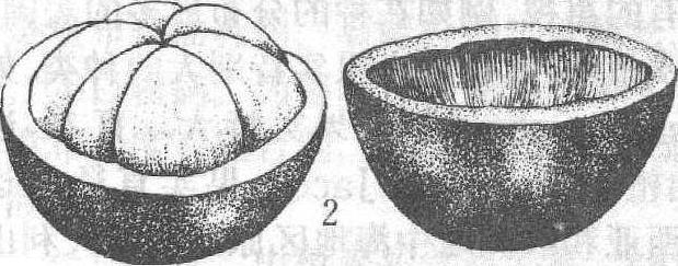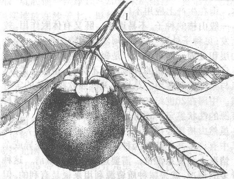 ![]() 山 竹 子 1. 果枝; 2. 果实 山竹子喜高温潮湿而适度荫蔽的环境, 低于20℃生长缓慢,低于5℃生长严重受阻, 甚至死亡。在降雨量少, 雨量分布不均匀的地区, 需具灌溉条件。最适园地为地下水位低于2米的冲积土或排水良好的壤土。 栽培技术要点 通常用种子繁殖, 也可空中压条(圈枝)或嫁接繁殖, 但成活率较低。种子不耐贮, 宜采后即播。幼苗生长缓慢,需遮荫培养2年或更长。苗高40~50厘米后定植,植距5~6米×4米。幼树需荫蔽适度,保持土壤潮润, 并施足基肥。实生苗植后7~15年结果。病虫害较少。 经济价值 果肉味甜嫩滑, 品质优良,有“热带果后”之称。果实可食部分占29~45%。果肉含可溶性固形物16.8%,有机酸(以柠檬酸汁)0.63%,维生素C12毫克/100克。果皮含单宁酸。树皮含树脂液, 可作藤黄原料。山竹子果多用于鲜食,也可制冷冻果汁等。由于植株生长慢, 商品性生产较少, 但品质优良, 成熟期较早, 中国海南省、广东湛江市和台湾南部可扩大试种面积。树形美观, 花、果和叶都有观赏价值, 是良好的热带庭园树种。 山竹子mangosteenGracinia mangostana L.,又称莽吉柿、倒捻子。藤黄科,山竹子属。常绿乔木,高达10m。原产马来西亚,斯里兰卡、印度、菲律宾有少量生产。中国广东、台湾有栽培。叶对生,长椭圆形,先端渐尖,全缘。花杂性,同株;雄花为3~9朵的顶生簇生花序;两性花单生或成对着生于枝头;每年2次开花结果。果实球形,直径6~8 cm,红紫色,有缩存的大型革质萼片。果壳厚而韧,内含5~7粒种子,种子薄而小,多来源于无性胚。2n=76。实生和嫁接繁殖。种子外披白色多汁香甜的假种皮,可供食用。