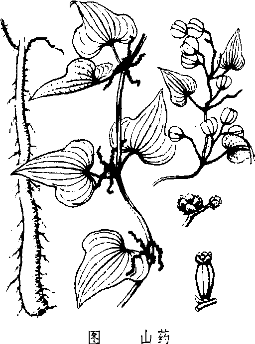 图3 零余子发芽长成的苗 地温约10℃时播种,先开沟,单行条播者在畦中央栽种,双行条播者在畦两侧开沟种植,深约10厘米,施肥后将种薯栽子(或段子)平放沟中,株距15~20厘米,随即覆土。若土壤水分不足,可先浇水后播种。出苗后茎叶生长快、细嫩脆弱,需及早支架扶蔓,并保留1~2个健壮苗和及时摘除蔓基部侧枝。山药主要根系分布于土壤表层,中耕宜浅,结合中耕追肥、浇水。苗期和发棵期适当浇水,促进根系深入土层; 块茎膨大盛期要始终保持土壤湿润:雨涝天注意及时排水,支架前铺施粪肥并配以速效氮肥。植株基部叶片老化时收获,冬季土壤不结冻的地区可陆续采收; 种用山药在霜降前掘出,应避免挖伤块茎,保留根群,去土后收藏。 贮藏加工 冬季多用窖藏,春暖时置篮内,于通风冷凉的室内挂藏,可至初夏。 加工品种为长山药,供药用。中国主要产地如河南博爱、沁阳,山东济宁,陕西华县,江西瑞昌。将鲜山药两端较细部分切去,浸水一天后取出,刮净外皮。后置熏炉中用硫磺熏蒸1~3天,待山药变软和出水时,取出晒干或烘干,即成粗制品,称“毛条”。每4~7公斤鲜山药产毛条1公斤。为使毛条洁白圆滑而具光泽,须再加工。将毛条浸水10~12小时,泡软时捞出,置席箔上晒半天。当毛条表面发亮时撒上淀粉,用搓板搓光表面; 当毛条发软时,再晒半天,并切成长16~18厘米的条,再撒上淀粉,用搓板直搓到薯条圆滑光洁后晒1~2天,充分干透,便成精制品,称“光条”。 病虫害 主要有白涩病 (Cylindrosporium dio-scoreae)、根腐病(Rhizoctonia solani)、炭疽病(Glo-oeosporium pestis)、褐色腐败病 (Fusarium oxyspo-rum)等。害虫主要有蛴螬、斜纹夜蛾等(见蔬菜虫害)。 山药又称“山芋”、“薯蓣”、“薯药”。宋陶谷《清异录》载,“淇上 (河南省北部淇县一带)薯药称最,大者号 ‘天公掌’,次者号 ‘榾拙羊’”。有野生、家生两种,为常用烹饪原料,李渔《闲情偶寄·饮馔部》载,“山药,则孤行、并用,无所不宜,并油、盐、酱、醋不设,亦能自呈其美,乃蔬食中之通材也”。山药还有强筋骨、壮脾胃之功效 (李时珍 《本草纲目》)。 山药见“薯蓣”条。 山药为薯蓣科多年生蔓生草本植物薯蓣的块茎。主产于河南怀庆地区。长江、黄河流域均有栽培。甘、平。归脾、肺、肾经。有益气养阴,补脾肺肾,涩精止带之功。主治下列病证: 山药薯蓣科多年生蔓生草本植物薯蓣的块根。性味甘平。健脾养胃,补肺益肾。用于老年脾胃虚弱、食少倦怠、便溏久泻,以及肺虚久咳、虚痨咳嗽;还可以用于肾气不足,遗精遗尿、消渴之症。每日取山药250克水煮代茶饮,补气养阴。常服多食,久病可愈,无病可养生。治疗消渴病有效。本品与粳米共煮粥以治脾虚食少、腹泻消瘦等症。 山药见“薯蓣”。 山药薯蓣科薯蓣属缠绕藤本植物。全属约有600种。缠绕茎蔓长可达3 m以上。须根系,分布于地下20~30 cm的土层中。单性花,雌雄异株,穗状花序,2~4对腋生。蒴果具3翅。茎蔓生长3~4个月后地下部分开始膨大。一般1株着生1~3个块茎。单株产量0.5~1.5 kg。中国山药有普通山药和田薯2个种。按块茎形状分长形、扁形、块状3个类型。茎叶生长适宜温度25~28℃,块茎生长适宜温度20~24℃。 |