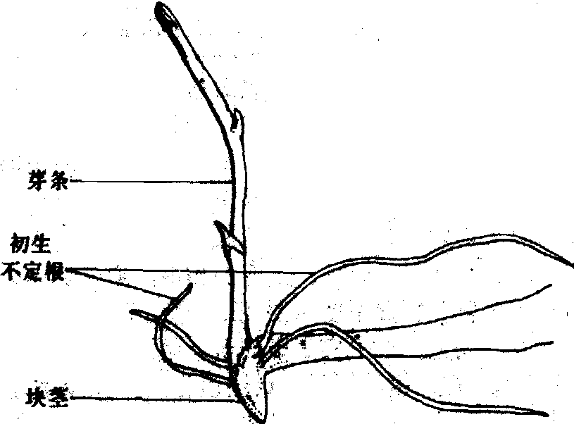 图2 山药发芽情况示意图 栽培技术 山药春种秋收,生长期长达180天以上。要求排水良好、疏松肥沃、土层深厚的砂壤土。栽培山药需深翻地,耕作深度扁块和圆筒种约30厘米,翻地后按60~80厘米作平畦或高畦; 长柱种按1米距深翻沟土,深60~100厘米,回填沟土后作畦。结合整地施用充分腐熟的粪肥,并与土壤充分掺和均匀。未腐熟的粪肥不宜深施,一般施于浅层或铺施畦面。每生产1 000公斤山药,需氮4.32公斤、磷1.07公斤、钾5.38公斤。山药每隔3~4年以零余子培养栽植材料用于播种(图3),植株生长势较旺,其余年份可用地下块茎切块繁殖。长柱种块茎茎端有一潜伏芽,常用带潜伏芽的一段做种,称“山药栽子”或“芽嘴子”; 块茎其余部分也可切段做种,称“山药段子”,长6~8厘米,出苗比“山药栽子”晚,因此播种前先催芽,栽植时横放。扁块种、圆筒种的块茎一般只有茎端能发芽,切块时要带着部分茎端纵切。