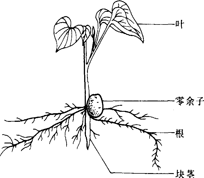 植物学性状 须根系。发芽后根着生于茎基部,呈水平方向伸展达1米,主要分布于20~30厘米的土层中。茎蔓生长达3米以上,横断面圆或多棱形,右旋,常带紫色。地下肥大产品器官的解剖结构具分散维管组织,因此为块茎,有长圆柱形、圆筒形、纺锤形、掌状或团块状等。周皮褐色,肉白色,表面密生须根。叶三角状卵形至广卵形,先端突尖,基部戟状心脏形,互生或对生,极少轮生,叶柄长,叶腋发生侧枝或形成气生块茎(称零余子),花单性,雌雄异株,穗状花序,2~4对腋生,花小、花被6,白或黄色。蒴果具3翅,扁卵圆形,栽培种极少结实(图1)。 种类和品种 中国栽培的山药有两个种。 普通山药(D.batatas Decne.) 又名家山药。染色体数2n=4x=40。也是日本的主要栽培种。叶对生,茎圆、无棱翼,叶脉7~9条突出。按块茎形状分为三个类型:❶扁块种:块茎扁形似脚掌,入土浅,适合浅土层及粘重土壤栽培,主要分布于南方,如江西、湖南、四川、贵州的脚板薯,浙江瑞安红薯。 ❷圆筒种:块茎短圆形或不规则团块状,长约15厘米,横断面直径10厘米,分布于南方,如浙江黄岩薯药、台湾圆薯。 ❸长柱种:块茎长30~100厘米,直径3~10厘米,主要分布于陕西、河南、山东、河北等省。块茎入土深,适合深厚土层的砂壤土栽培。名贵品种有河南博爱、陕西华县的怀山药、河北省武骘山药、山东济宁米山药、江西南城准山药等。 田薯(D.alata L.) 又名大薯、柱薯。染色体数2n=3x=30、2n=8x=80。中国主要分布于台湾、广东、广西、福建、江西等省(区)。茎具棱翼,叶柄短,叶脉多为7条。块茎甚大,有的重达40公斤以上。按块茎形状也有三个类型:❶扁块种:如广东葵薯,福建银杏薯,江西南城脚薯。 ❷圆筒种:如台湾白圆薯;广州早白薯、大白薯,广西苍梧大薯。 ❸长柱种:如台湾长白薯、长赤薯,广州黎洞薯,江西广丰千金薯和牛腿薯等。 生长发育和块茎形成 山药用地下块茎或气生块茎繁殖。茎叶生长喜温暖,畏霜冻,适温为25~28℃。块茎生长适宜地温20~24℃。发芽要求土壤温度15℃左右。一年一茬,于终霜时出苗,霜降时收获。块茎耐-15℃地温。发芽后先抽生芽条,在芽条基部发根,发芽期30~50天(图2)。芽条长1米时开始展叶,继而枝条不断伸长和发生新叶,直到显蕾或叶腋着生气生块茎止,为发棵期,以茎叶生长为主,约60天。显蕾后茎叶与块茎同时旺盛生长,渐以块茎为主,直至茎叶衰败,约需60天以上,为块茎膨大期。此期块茎积累的干物量占总干重的85%以上,绝对积累量超过茎叶一倍,块茎根端有一群始终保持分生能力的细胞,块茎形成是这部分细胞不断增殖和膨大的结果。