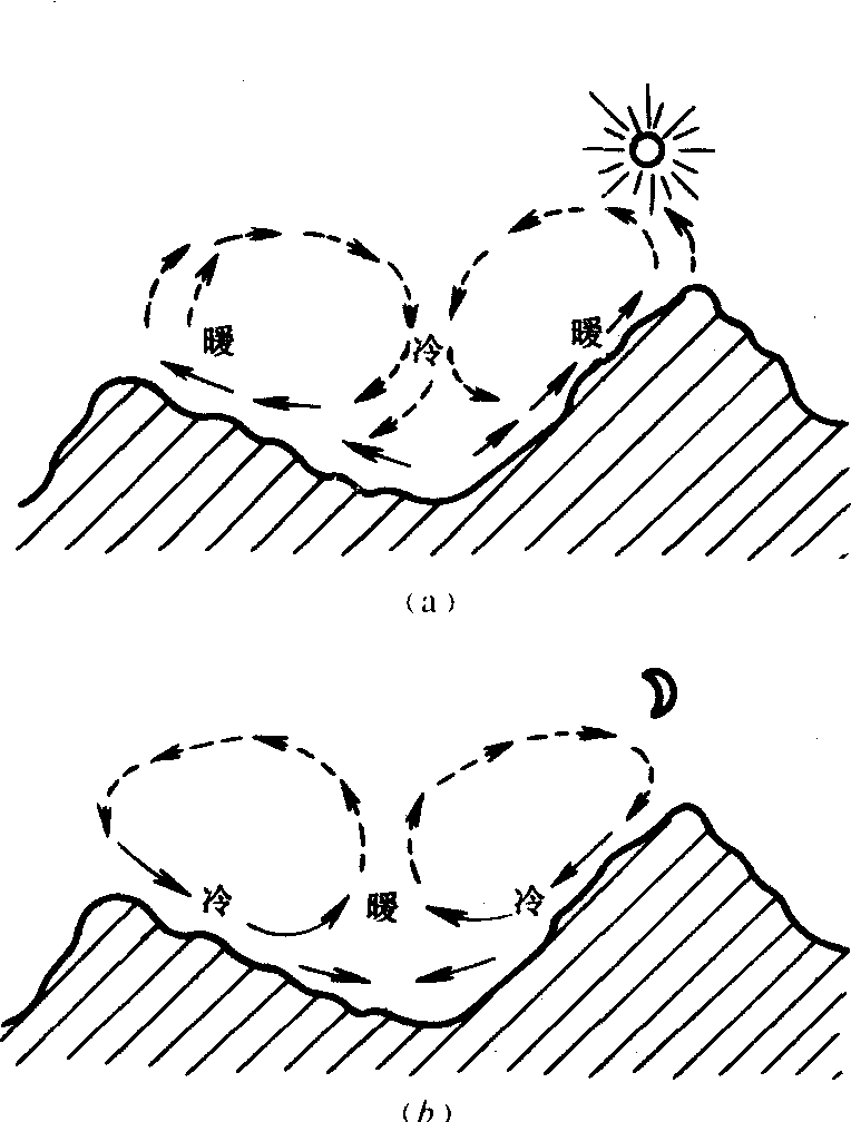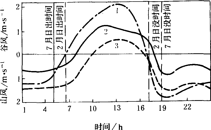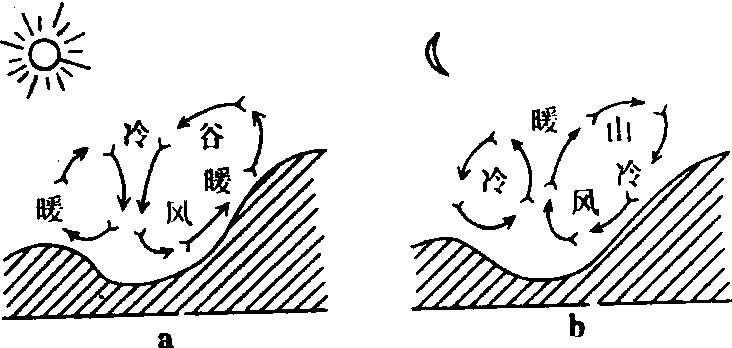 图2 山谷风风速的日变化 山谷风Shangufeng在山区,由于下垫面受热不均匀而引起的以一日为周期、风向相反的地方性风系。白天风从山谷吹向山坡,叫谷风;夜间风从山坡吹向山谷,叫山风(如图所示)。谷风的形成是由于白天山坡上的空气受热快增温多,而山谷中同高度上的空气,由于距地面较远,受热慢增温较小,因而出现由山谷指向山坡的水平气压梯度,形成热力环流,下层风由谷底吹向山坡。山风的形成是由于夜间山对大气是个冷源,山坡辐射冷却快,气温降低多,谷中同高度上的空气则冷却较慢,降温少,因而形成与白天方向相反的热力环流,下层风由山坡吹向山谷。因白天山坡受热所造成的温差,一般比夜间辐射冷却造成的温差大,故谷风风速常大于山风。山谷风是山区在晴朗而稳定的天气条件下,常可观测到的现象。在热带和副热带的干季,温带的夏季,山谷风最为明显。在平原与高原相接地区,由于高原边缘地面气温与平原上空同高度上的气温差异,也会出现类似山谷风现象。