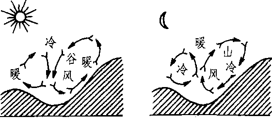 白天-谷风 夜间-山风 山谷风 山谷风山地区域风向昼夜间发生反向转变的风。白天山坡增温剧烈,空气自山谷沿山坡上升,形成谷风;夜间山坡冷却较山谷快,空气自上沿山坡下滑,形成山风。山谷风常发生在晴朗而稳定的天气条件下,热带、副热带的干季,温带的夏季最为明显。 山谷风mountainvalley breeze山区风向昼夜变化显著的风。白天风从山谷吹向山坡,夜间风从山坡吹向山谷。由于白天山坡被阳光照射而受热、贴近坡面的空气增温比与坡面同高度的山谷上方的空气要强烈得多,于是山坡上的暖空气不断沿坡上升,并从山坡上空流向山谷上空,谷底的空气就沿山坡向山顶补充,这样在山坡与山谷之间形成了局地环流,此种由谷底吹向山坡的风称为谷风。夜间,山坡辐射冷却降温比与坡面同高度的山谷上方的空气也要剧烈得多,于是山坡上的冷空气顺坡面流入谷底,谷底的空气则因汇合而上升,并从上空向山顶流去,形成一个与白天相反的局地环流,此种沿山坡吹向谷底的风称为山谷风。通常谷风强于山风,并且在晴天时,山谷风才发展显著。在季节上,夏季的山谷风比冬季要显著。