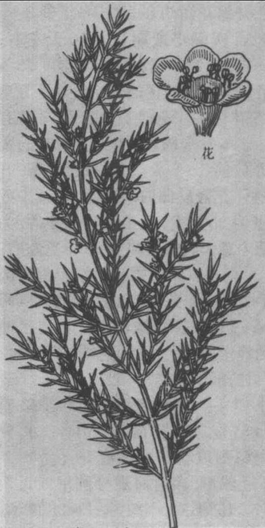 | 释义 | 岗松shrubby baeckea中国华南地区优良的夏季蜜源植物。别名铁扫把、扫把枝。学名Baeckea frutescens L.。桃金娘科。灌木,多分枝,高30~150厘米。单叶对生,叶片细小,条形或条状锥形。花单生于叶腋中,两性,黄白色,直径2~3毫米。蜜腺位于花冠内子房基部。蒴果,长约1毫米。(见图)