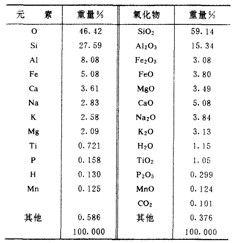 | 释义 | 岩浆岩的成分yan jiangyan de chengfen指岩浆岩的化学成分和矿物成分。岩浆岩的化学成分几乎包括了地壳中的所有元素,但是其含量差别悬殊,其中以O、Si、Al、Fe、Ca、Na、K、Mg、Ti等元素的含量最多,占组成岩浆岩化学元素总量的99%以上。岩浆岩的平均化学成分如表1。 表1 岩浆岩的平均化学成分