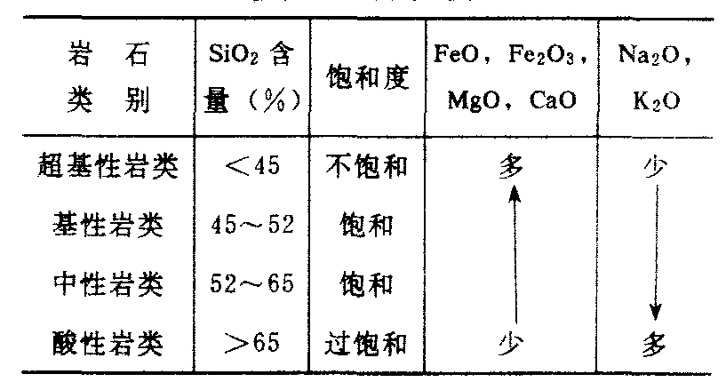 注: 据克拉克、华盛顿1924年对5159块岩浆岩标本进行化学分析结果。 根据SiO2的含量可将岩浆岩分为:超基性岩、基性岩、中性岩和酸性岩四大类(表2)。在超基性岩里由于SiO2含量较低,岩浆中出现最早结晶含SiO2少的橄榄石,这类岩石称不饱和岩石; 在酸性岩中,由于SiO2含量较高,过剩的SiO2就可以游离出来形成石英,这类岩石称过饱和岩石; 在基性岩和中性岩里,SiO2的含量比较适中,一般只含有较少或不含有橄榄石和石英,这类岩石称饱和岩石。从酸性岩到超基性岩,SiO2含量不断减少,但是FeO、Fe2O3、MgO、CaO的含量逐渐增加,而Na2O和K2O的含量却逐渐减少(表2)。 表2 岩浆岩的化学分类