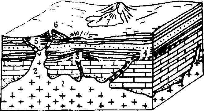 1. 岩基;2. 岩株;3. 岩盘;4. 岩床;5. 岩墙和岩脉;6. 火山锥;7.熔岩流