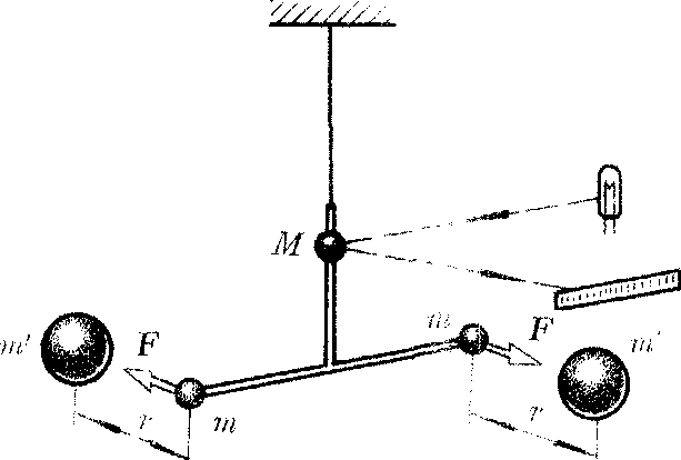| 释义 | 万有引力恒量wanyouyinli hengliang万有引力定律表达式中的比例系数G。又称万有引力常数。简称引力常数或引力恒量。它是对所有质点都有相同数值的普适常数。根据近代的实验测定,被公认的数值是G=(6.672 0±0.004 1)×10-11牛顿·米2/千克2。牛顿发现了万有引力定律,但是没有给出万有引力恒量G的数值。因为要确定这个数值,必须要测量出两个已知质量的物体之间的引力大小,而地面上一般物体间的引力非常小,由于当时实验条件和技术的限制,很难进行精确的测量。尽管如此,牛顿仍指出G值很小。1798年,即在牛顿发现万有引力定律100多年后,英国的卡文迪什(Cavendisn,1731~1810)巧妙地利用扭秤装置,第 一次在实验室里对两个物体间的万有引力大小作了比较精确的测量和计算。卡文迪什扭秤的主要部分是 一个轻而坚固的“T”形架,倒挂在一 根石英丝的下端,如图示。“T”形架水平杆的两端,各固定着一个质量为m的小球,在T形架的竖直杆上固定着一块小平面镜M,它用来将射入的光线反射到一根刻度尺上。实验时,把两个质量为m′的大球放在图中所示的位置,它们跟小球的距离均为γ。由于m受到m′的吸引,T形架受到力矩作用而转动,石英丝发生扭转而产生一个相反的力矩,当两个引力F对T形架的扭转力矩τ跟石英丝对T形架的扭转力矩τ1相平衡时,T形架静止不动。这时石英丝扭转的角度θ可以从小镜M的反射光在刻度尺上移动的距离求出。根据τ=2F·L/2=F·L(L是T形架水平杆的长度),τ′=кθ(к是石英丝的扭转常数,它可以由扭摆振动周期公式γ=2π·