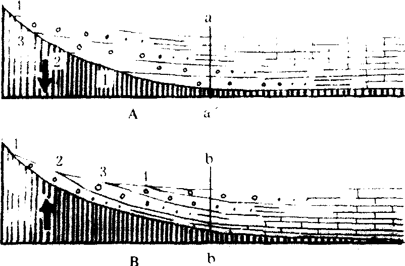 海侵层位(A)和海退层位(B) 1、2、3、4.海面位置的变化;aa′、bb′.垂直剖面 |