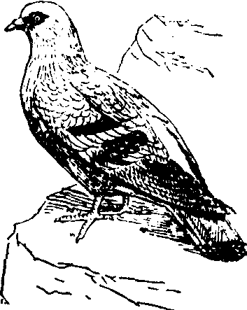 图352 岩鸽 岩鸽blue hill pigeonColumba rupestris Pallas,又称山石鸽。鸟纲,鸽形目,鸠鸽科(Columbidae)。大小和体色均似家鸽,体长可达35 cm。雄鸟头和颈暗青灰色,颈和前胸有紫绿色金属光泽。喙黑色。跗蹠和趾珊瑚红色。两翼折合时有两道明显的黑色横带斑。腰和近尾端各有一道白色横带,区别于家鸽或原鸽。雌雄羽色相近,而雌鸟羽色较暗。栖息于山区岩石和峭壁。食物为植物性,有各种种子、果实等。飞行迅速,并善疾走。繁殖于4~7月,营巢于岩缝、悬岩峭壁岩洞中,以小树枝筑成。每窝产卵2枚,白色。中国广泛分布于东北、华北及四川西部。数量稀少,应予以保护。