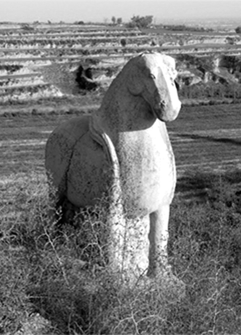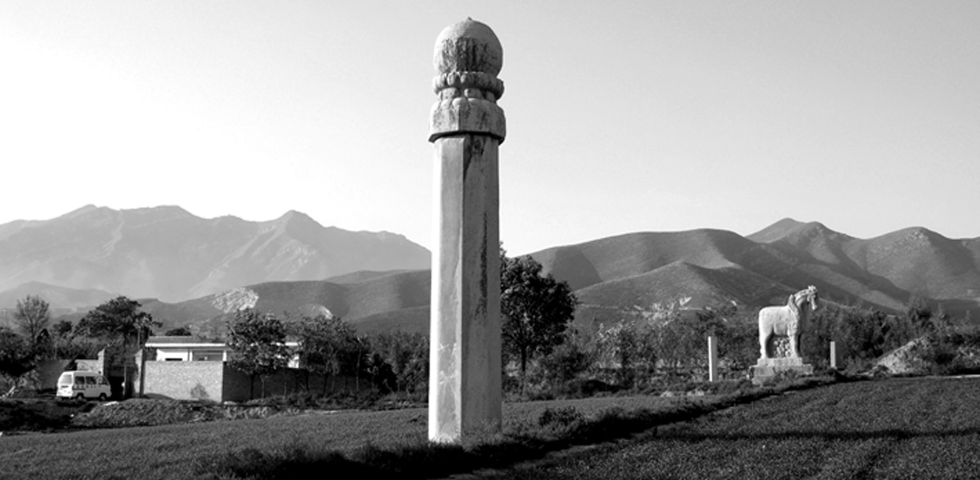 | 释义 | 崇陵神道石刻chonɡlinɡ shendɑo shike唐代。位于泾阳县蒋路乡。唐德宗李适崇陵石刻。现存30件,均为青石质。自乳台阙址北108米处起始,分东、西两列向北排列,两列间距70.4米。依次为:华表1对,通高7.88米,方形基座,边长1.57米,八棱柱身,覆莲宝珠顶。向北22米为翼马1对,马高2.69米,身长2.53米,独角,长颈,高腿,三长翎组成翼翅。再北22米为驼鸟1件(东列),浮雕于石屏上,屏高1.52米,宽2.05米,厚0.32米,驼鸟头颈弯曲后折于翅上,雕刻较粗疏,仅尾部羽毛清晰。再北22.4米为递次向前排列的仗马4对(佚1),每对亦隔22.4米。仗马均残,残长1.45米~1.8米,背置鞍鞯,披障泥,饰鞅鞦,尾下垂。再北22.4米为递次向前排列的翁仲9对,每对亦隔22.4米,均为立姿,身高(含残者)2.05米~2.85米。东列文官,戴冠,着宽袖长袍,左侧佩剑,足登圆头履,双手执笏于胸前;西列武官,戴高冠,穿广袖袍,腰间束带,脚着靴,双手拄九节剑。