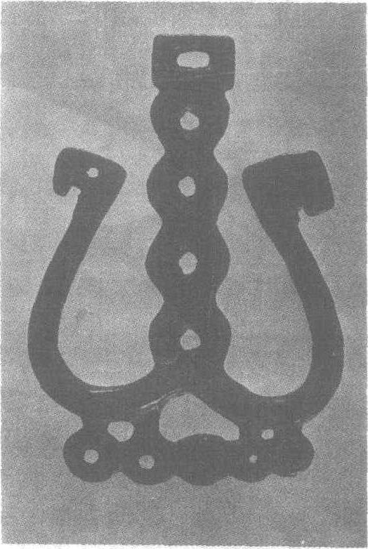| 释义 | 嵌松石双虺形铜具春秋。长10.2厘米,宽7.2厘米。1958年辽宁省朝阳县十二台营子2号青铜短剑墓出土。辽宁省博物馆藏。此器似锚形。主体为两只昂首翘尾如乙字形的虺,相背而立,两尾互相纠结,盘绕而上,顶加一方形系环。两虺共四足,中间再连一环,成为五个联珠式装饰,垂于身下。虺的前身翘曲如钩,首方折,口鼻下垂如鹰嘴。通身嵌绿松石数处。构形奇特,铸作精美。