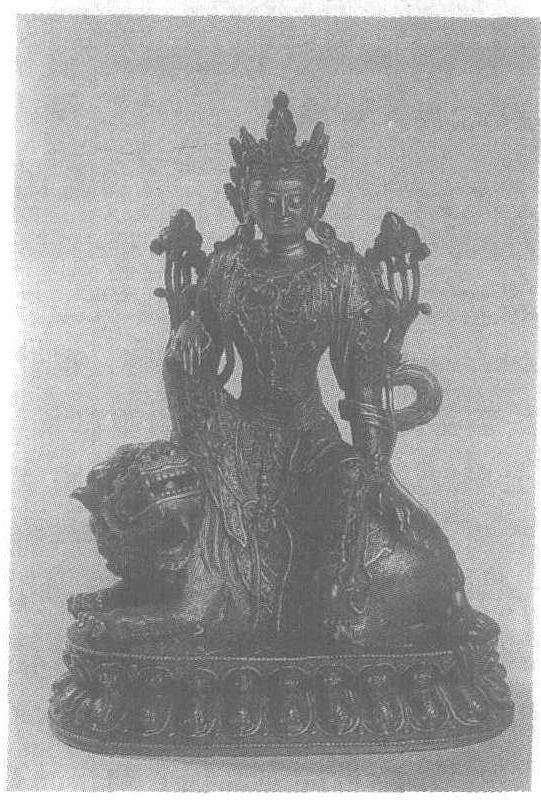 清。高31.4厘米,座长23.4厘米,宽10.3厘米。上海博物馆藏。菩萨头戴宝冠,高髻,面相丰满,衲衣紧贴。手臂两侧饰莲花,璎珞周身满挂。骑坐狮子,神态沉静。作于清代乾隆年间。铜质精纯,胎骨厚重。掐丝、镶嵌、镀金技艺纯熟,是嵌珐琅中不可多得的精品。