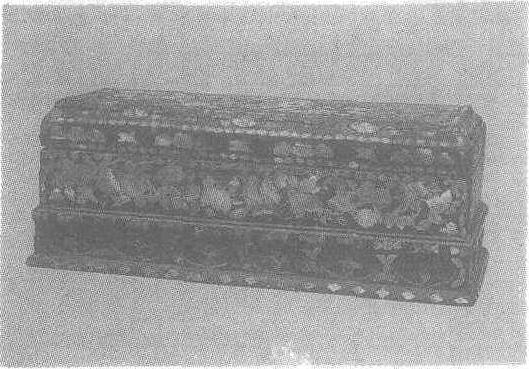 | 释义 | 嵌螺钿花鸟纹黑漆经箱五代。长35厘米,宽12厘米,高12.5厘米。1978年江苏省苏州市瑞光塔出土。苏州博物馆藏。盝顶,长方形,子母口,须弥座。通体饰黑漆,上镶嵌厚螺钿片花纹,呈带状分布:自盖顶向下分别为团花带,连珠夹飞鸟、散花带,石榴、折枝花带,花间饰堆漆描金卷草带、菱花带等。此经箱是我国早期嵌螺钿器的精品,对研究唐代以来我国螺钿工艺的发展有着重要的意义。嵌螺钿见“嵌螺钿朱漆龙纹盘”条目。