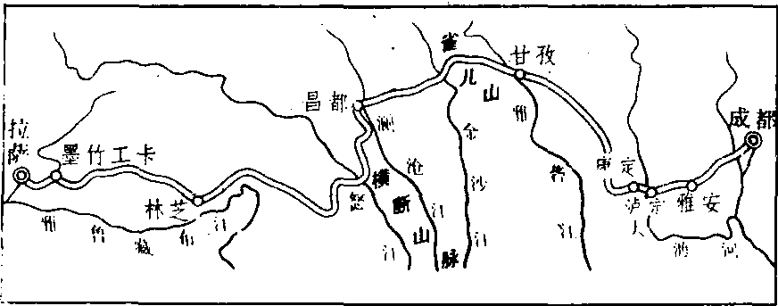 | 释义 | 033 川藏公路成都至拉萨公路,全长2410公里,称川藏“北线”。1950年4月动工,1954年11月27日通车。公路沿线地势复杂而险峻,工程艰巨。越过海拔3000—5000米的二郎山、折多山等14座高山,跨过大渡河、金沙江等几十条大小急流。北线开挖土石方3000万米3,建桥涵3000多座,还有大量的护墙等。全线大部分通过地震区,克服了岩堆、泥石流等不良地带;穿过原始森林和草原沼泽地带。1955年以后,进行养护改修,还在怒江西岸修建长45米的隧道。为发展经济、缩短里程,打通了从东俄洛,经雅江、理塘、巴塘、芒康、左贡,与北线的邦达相通的“南线”,使路程缩短了273公里。川藏公路开辟了内地通往西藏的陆路交通,加速了西藏的建设。 川藏公路Chuanzang gonglu我国目前最长的公路,也是西藏与外省交往的重要通道。从四川省成都向西经雅安、康定、甘孜、马尼干戈、昌都到西藏自治区拉萨,全长2 400余公里。川藏公路雅安至拉萨段原名康藏公路,后以成都为起点,更为今名。成都至雅安段为旧线;雅安至马尼干戈段,1950年利用旧线改筑;马尼干戈至拉萨段,1951年动工,1954年通车。筑路工程艰巨,由成都平原登上青藏高原,要越过横断山脉,沿途高山峡谷,相对高差达1 000多米。先后跨越大渡河、雅砻江、金沙江、澜沧江、怒江等12条急流大河;穿越二郎山、折多山、雀儿山等14座大山;穿过地震、泥石流、冰川、沼泽等复杂的地质地形区。其中雀儿山口为全线最高处,海拔约为5 000米。此处气温低,风雪天气多,全年之中约有半年为风雪所弥漫。此条公路由于山路起伏过大,坡道又多又长,线路上又有山洪、泥石流、雪崩等危害交通,运量受到一定限制。一般在昌都以东的货运由它承担,其中西运的货物有粮食、副食品、布匹、日用工业品、茶叶、食盐等;东运出藏的货物有矿石、药材、畜产品等。