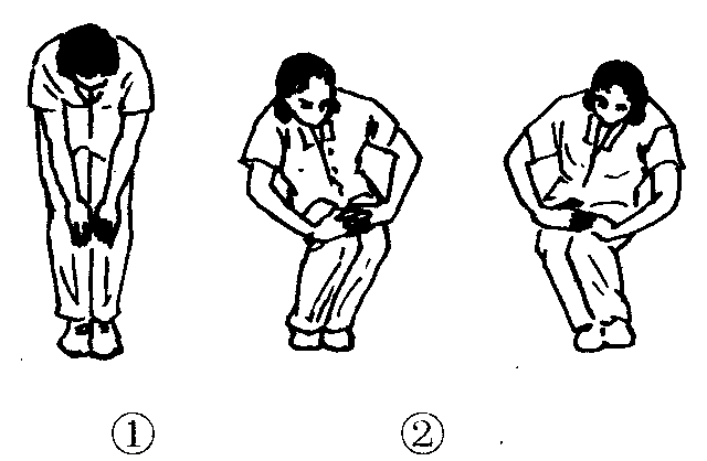练功十八法第3套第1节。动作过程:上体前屈,两手扶膝。(图2—4—133—❶)❶两腿屈膝半蹲,向顺时针方向绕环一周。(图2—4—133—❷)❷腿绕后时伸直,并还原成预备姿势。共做2~4个八拍。注意事项:两膝绕环时幅度要大,动作不要过快,脚跟不得离地。要先顺时针方向做2个8拍,再做逆时针方向2个8拍。此功法对于膝、踝关节酸痛有一定的治疗效果。
