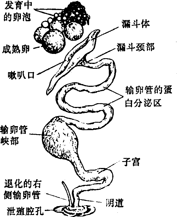 | 释义 | 左输卵管zuoshuluanguan雌鸟的输卵管,在胚胎期是左右成对的,成鸟的右侧输卵管一般退化(隼形目多数个体例外),而仅有左侧输卵管,这与适应空中飞翔生活和产生大型硬壳卵有关。幼鸟的左输卵管不发达,呈白绒状。成鸟的左输卵管较长,管壁的肌肉层宽厚,并有较多的弯曲,前端为宽大的漏斗,开口(喇叭口)于左卵巢附近的体腔内,可接受来自卵巢的成熟卵。根据左输卵管的结构与功能,可区分为3段:上段称腺体部(精子与卵细胞在此融合成受精卵),此段管壁粘膜层的腺体,可分泌大量较浓的卵白(卵带在此形成);中段称峡部,管道狭窄,可分泌形成内外壳膜的物质和稀卵白;下段为子宫部,管壁较薄,并膨大呈囊状,主要分泌形成钙质卵壳的物质,所以又称壳腺部。子宫的下面为短小的阴道,开口于泄殖腔内。有些卵壳上具有各种不同的色彩式斑纹,是由左输卵管下段末端管壁上的色素细胞,于卵产出前5~6小时而分泌形成的。1个成熟卵在整个左输卵管内,一般要经过21~23小时方可排出,在上段腺体部约经3个小时,在中段峡部约经2~3小时,在下段子宫部,正常时约经16~17小时。