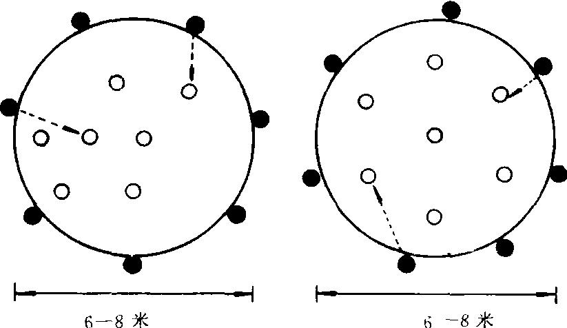 游戏方法 把学生分成两队,每队再分甲、乙两组,甲组在圈内,乙组在圈外手持两个排球。教师发令后,乙组用排球投击甲组学生,甲组学生在圈内躲闪,如被击中就退出圈外。游戏进行到规定的时间,甲、乙两组交换位置,最后以被击中人数少的组为胜。 游戏规则 ❶圈外学生不得进入圈内投掷。 ❷只能投掷膝以下部位。 ❸圈内学生被迫出圈算被击中。 |