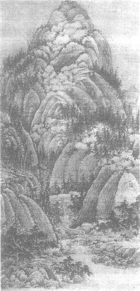 | 释义 | 巨然《秋山问道图》立轴,绢本,水墨。此图中主峰高耸,却与北方山水画派中坚硬挺拔的山峰不同,显出柔婉葱郁的气质。画面中部两山环抱下,几间茅屋在丛林中半隐半现。柴扉大开,主人坐于蒲团之上,另一人侧身半露,想必是前来问路的人。山脚下古树偃仰,芦草迎风,卵石逶迤,曲径通幽,直把观者视线引至芦草堂前,点明了主题。