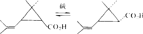 通过某些反应,生成差向异构体的过程。凡含有两个或两个以上手性碳原子分子的立体异构体中,只有一个手性碳原子的、构型不同的两个异构体互为差向异构体。差向异构化一般在酸、碱、热作用下进行,有时也通过其他过程,如自由基过程、消除一加成过程进行。差向异构化可用于农药合成中,例如,顺式-(1S)菊酸在碱的作用下,部分转化为反式-(1R)菊酸,就是一个差向异构化过程(见图)。