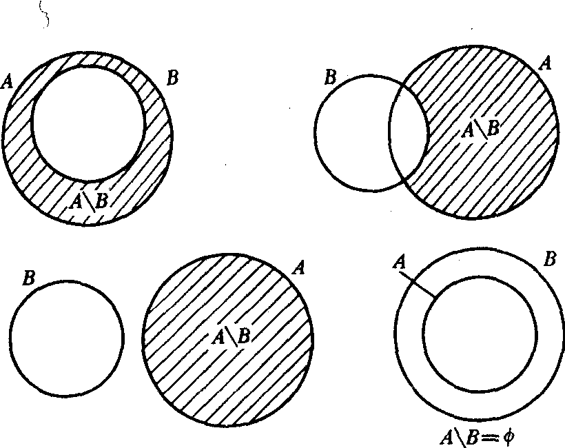 ![]() 差集chaji对于两个集合A和B,由所有只属于A不属于B的元素所组成的集合,称为A与B的差集,记作A\\B。例如:A={1,2,3,4,5},B={3,5,7,9},则A\\B={1,2,4};又如:A={幼儿园的所有老师},B={幼儿园的所有幼儿},则A\\B={幼儿园的所有老师}。用韦恩图分别表示如下: