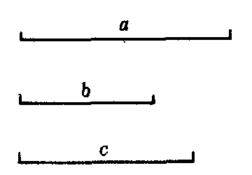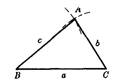 作法 ❶作线段BC=a; ❷以B为圆心,c为半径作弧; ❸以C为圆心,b为半径作弧,交前弧于A; ❹连结AB和AC.则△ABC就是所求的三角形. 讨论 当a,b,c,三条线段中,最长的一条大于或等于其他两条的和时,本题无解. |
