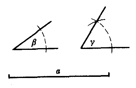 作法 ❶作线段BC=a; ❷在BC同旁作∠CBD=∠β,∠BCE=∠γ,BD和CE相交于A.则△ABC就是所求的三角形. 讨论 当∠β+∠γ≥180°时,本题无解. |