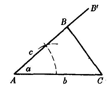 已知 线段b,c及∠a.求作△ABC,使AB=c,AC=b,∠A=∠a. 作法 ❶作线段AC,使AC=b, ❷作∠B′AC,使∠B′AC=∠a; ❸以A为圆心,c为半径作弧交AB′于B; ❹连结BC.则△ABC为所求的三角形. |