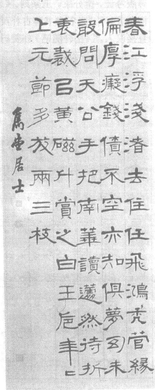 | 释义 | 巴慰祖隶书五言诗轴清。纸本。纵125厘米,横48.3厘米。北京故宫博物院藏。巴慰祖(清乾隆九年—乾隆五十八年,即1744—1793年),字予籍,一字子安,号㑺堂、莲舫,安徽歙县人。官候补中书。富收藏,精鉴赏。通文艺,擅书、画、篆刻,名动一时。清汪中《述学别录·巴予籍传》评:“予籍少好刻印,务穷其学。旁及锺鼎款识秦汉石刻,遂工隶书,劲险飞动,有建宁延熹遗意。”观此幅隶书,清雅爽丽,师法汉隶,融进冷隽疏淡的意韵,在用墨和布白上尤见功力。