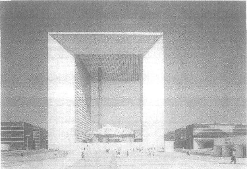 | 释义 | 巴黎德方斯区规划位于巴黎西北塞纳河畔,在卢佛尔宫、星形广场和巴黎市中心香榭丽舍林荫大道形成的中轴延长线上,距凯旋门五公里,是巴黎城市9个副都心之一,作为2000年巴黎的“橱窗”,是工作、居住、游乐和城市公共设施齐备的商业事务区,从1932年开始规划到80年代已初具规模。德方斯区的规划和建筑注重合理使用城市空间,严格实行人车分流的原则,车辆全部在地下三层的交通道内行驶,地面全部为步行和绿化设施用地,在区中心还建有一个长600m、宽70m巨大的人工平台,布置步行道、花园和人工湖等,是供市民休憩娱乐的场所。作为香榭丽舍大道中轴延长线上的视觉标志,建造了富于纪念性,采取简洁庄重的门型造型的跨度达218m的办公楼,和高190m的摩天楼,在巴黎中轴低缓的天际线上形成一个高潮,成为巴黎市中心由埃菲尔铁塔向外延伸的一个新的视觉焦点。