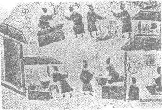 市井画像砖1965年四川省新繁县征集,新繁县文化馆藏。东汉砖刻艺术品。长39厘米,宽47厘米。画面市井呈平面四方形,外圈筑有市门3座,均为三开间;市肆4部分,排列有序;市遂(街道)为十字形,有路人与商贩行走其间;中心位置有市楼,又称市亭,属管理市井的官府机构。古籍记载汉时的四川商业繁荣,此画像砖为此提供了证据,且以形象的图画,令人信服。 |