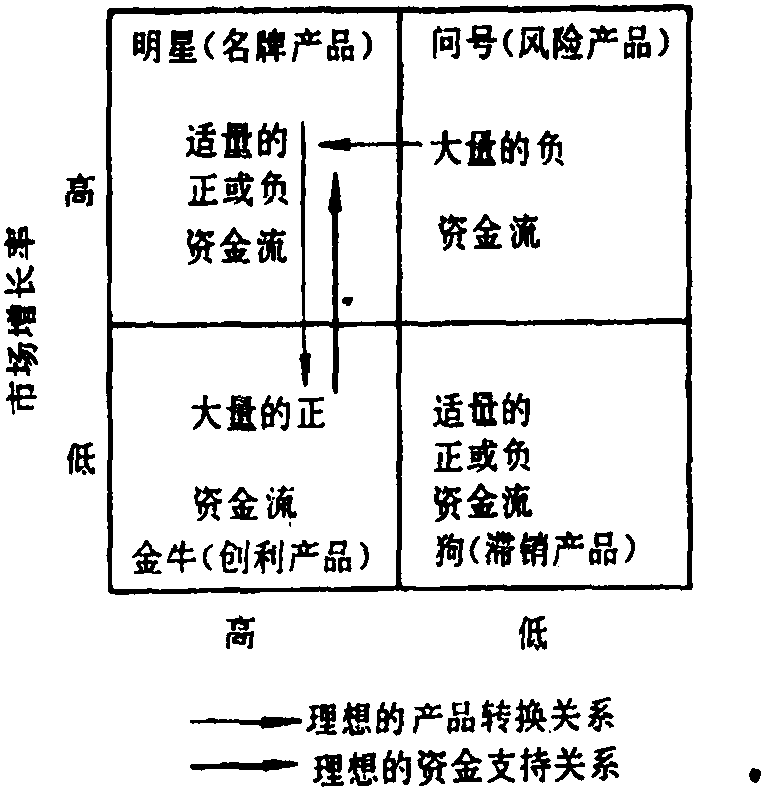 | 释义 | 市场增长一市场份额矩阵这一矩阵战略是以产品业务的市场销售增长率为纵轴,以企业产品的相对市场占有为横轴,纵横轴中间各以某种特定的比率为标准划分高低,形成四个象限,每一个象限都代表着不同的产品业务的相对的市场地位。如图26所示。