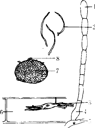 布氏白粉菌属 1. 分生孢子 2. 镰形刚毛3. 吸器 4.分生孢子梗基部5. 菌丝 6. 寄主细胞 7. 闭囊壳 8.附属丝 |