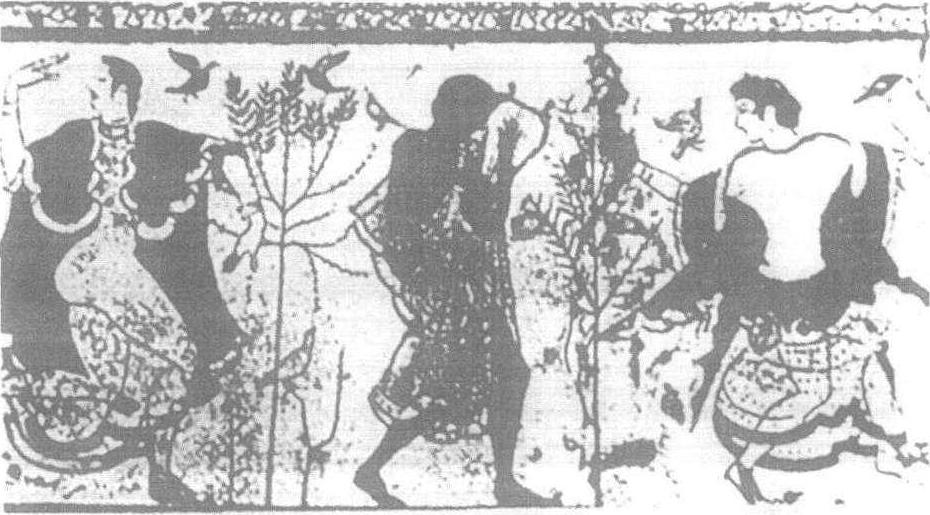 埃特鲁斯坎壁画 希腊时代的雕刻有许多的遗物,而绘画却几乎没有遗留下来。可幸的是我们可以通过许多的陶器上面所描绘的场景,了解到当时的绘画水平。 希腊的陶器,从几何形纹样的时期到公元前5世纪末,显示出一种不断的发展。将容器的表面区分成几个地带,在其赤褐色的底面上,用黑色填满规则整齐而有节奏的卐、十字形图案和之字、锯齿形连续纹样的几何风格,不久就渐渐变成一种在科林斯和其他 一些岛屿上出现的,受东方影响的,丰富多彩的动植物纹、人物纹风格。衔接着它的,是把形象全涂成黑色,用针划出内部轮廓的阿提卡的黑像式。到了公元前6世纪末的时候,这种黑像式又为红像式——一种将形象以外部分全涂成黑色,并用更为自由的线条描绘出形像的内部轮廓的画法——所取代。与此平行,在公元前5世纪还盛行 一种在白底子上进行彩描的形式(多为墓葬用的油瓶)。然而这以后,随着雅典在伯罗奔尼撒战争中的败北,希腊的制陶业也迅速地衰落下去。 在意大利中部,亚平宁山脉的东麓,为阿诺河、特韦雷河和第勒尼安海所环绕的地带,它介于佛罗伦萨和罗马之间,自公元前8世纪起繁荣了六、七百年,这就是埃特鲁斯坎文化。关于这个民族还有很多方面不甚了解,但 一般认为他们是在公元前1000年至前800年前后,从地中海东岸渡海渐渐迁徙至此的非印欧民族。到了公元前5世纪末他们有 一段衰退期,不久又慢慢地扩大其势力,把罗马的版图也吸收了进来,和希腊 一起,对罗马文化的形成,给予了不小的影响。 埃特鲁斯坎人的绘画使我们对早已绝迹的希腊原始壁画的本来面目,可以有一个相当明晰的概念。他们除少数板绘、棺侧的画之外,差不多都是墓室内的壁画。希腊古老时期的瓶画不像这些壁画能将人放在自然背景之中。这些壁画大多采用宴席、舞蹈、奏乐、狩猎等快活生活的主题,也有表现特定事件(神话和历史)的,总之是没有令人想到死的东西。墓室采用挖掉凝灰岩的办法建成,天井大体成倾斜成人字形屋顶的形状。墓室表面涂有石灰,在天井、破风、壁面部分,仿照唐草纹样或用平行线划分段落,再用线条描绘出图画轮廓并平涂上色彩,色彩以青、茶、绿、淡红为主,不拘泥于对象实际的颜色而显示出 一种装饰效果。 一般认为,罗马的建国是在公元前753年,但比这大约要早两个半世纪,是传说的诸王的时代,在七个山头上住着各个不同的种族。相传在帕拉丁纳有拉提乌姆人,在埃斯揆利纳、魁里纳尔有萨宾人,在维明那尔有埃特鲁斯坎人。他们在共和制时期,开始从埃特鲁斯坎,后又从希腊人学习建筑、雕刻、绘画的技术,随着国势的日益强盛而将其发展到了很大的规模。四个山头之间的洼地,成了政治、经济的中心,兴建神庙,设置元老院,并在遥远的北方和东方,还修建了引水道和浴室等。在随后的帝政时期,由于希腊美术的移入和对其掠夺达于鼎盛,在今弗利地方的建筑物几乎全部被改建或扩建,罗马风也被推广到了大帝国的全域。
